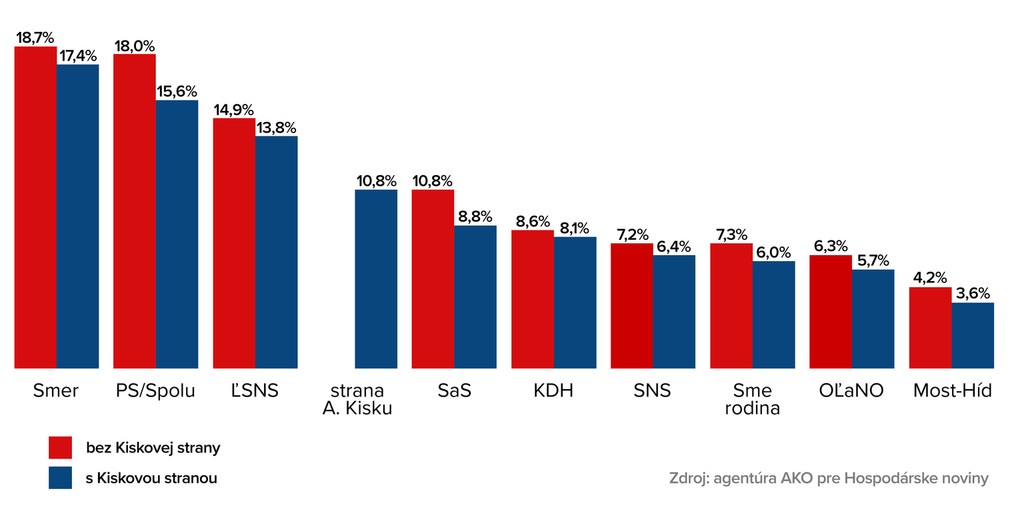 Prvý prieskum, ktorý meral preferencie aj novovznikajúcej strane Andreja Kisku. Podľa neho by tento politický projekt získal takmer 11 percent. Niektoré strany by mohli mať problém sa dostať do parlamentu. Prieskum robila agentúra AKO pre Hospodárske noviny.