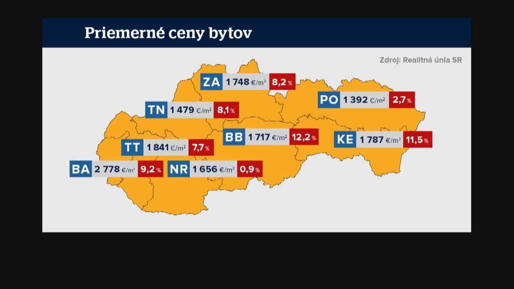 Pozreli sme sa, ako to vyzerá s priemernými cenami bytov na Slovensku. Za prvých deväť mesiacov roka išli najviac hore práve v Banskej Bystrici - o vyše 12 percent. Nasledujú Košice s 11,5-percentným zdražením a Bratislava s vyše 9 percentami. Naopak v Nitre a Prešove rástli ceny bytov najmenej výrazne.
