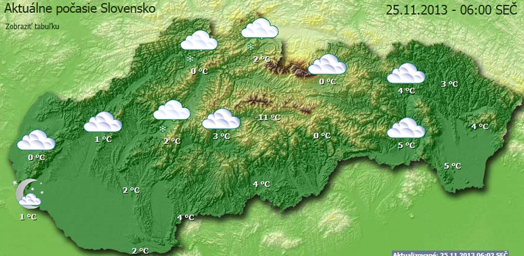 Na strednom Slovensku má byť polooblačno až oblačno, ale na severe bude obloha až zamračená a práve tu očakávame sneženie alebo snehové prehánky. Pozor bude tu fúkať nárazový vietor, ktorý môže dosahovať až silu víchrice. Na juhu bude zrážok menej, a teda snežiť má len ojedinele, skôr to budú zrážky zmiešané.