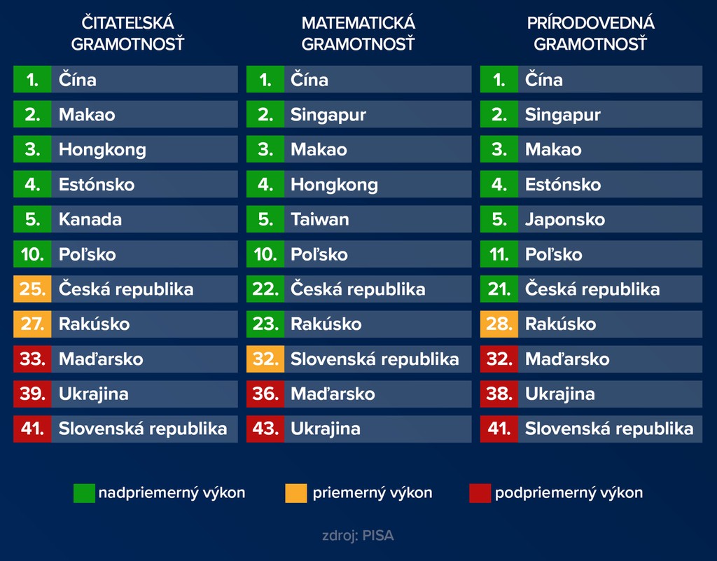 Kým v čitateľskej a prírodovednej gramotnosti slovenskí 15-roční žiaci naďalej zaostávajú za priemerom krajín Organizácie pre hospodársku spoluprácu a rozvoj (OECD), významné zlepšenie nastalo aspoň v matematickej gramotnosti.