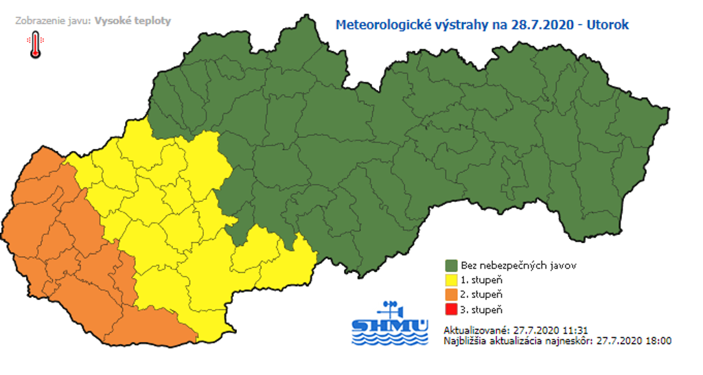 Slovenský hydrometeorologický ústav (SHMÚ) vydal na utorok výstrahy pred horúčavami na západnom Slovensku. Výstrahy pred horúčavami II. stupňa sú vyhlásené na Záhorí, v Bratislavskom a Trnavskom kraji.