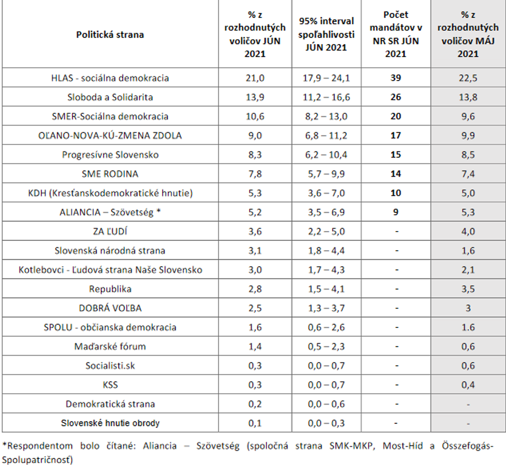 Ak by sa parlamentné voľby konali v júni, tak by ich podľa prieskumu agentúry AKO vyhral opozičný Hlas s 21 percentami. Druhou najsilnejšou stranou by bola s takmer 14 percentami koaličná SaS. Prvú trojku by uzatváral Smer s viac ako 10,5 percentami.