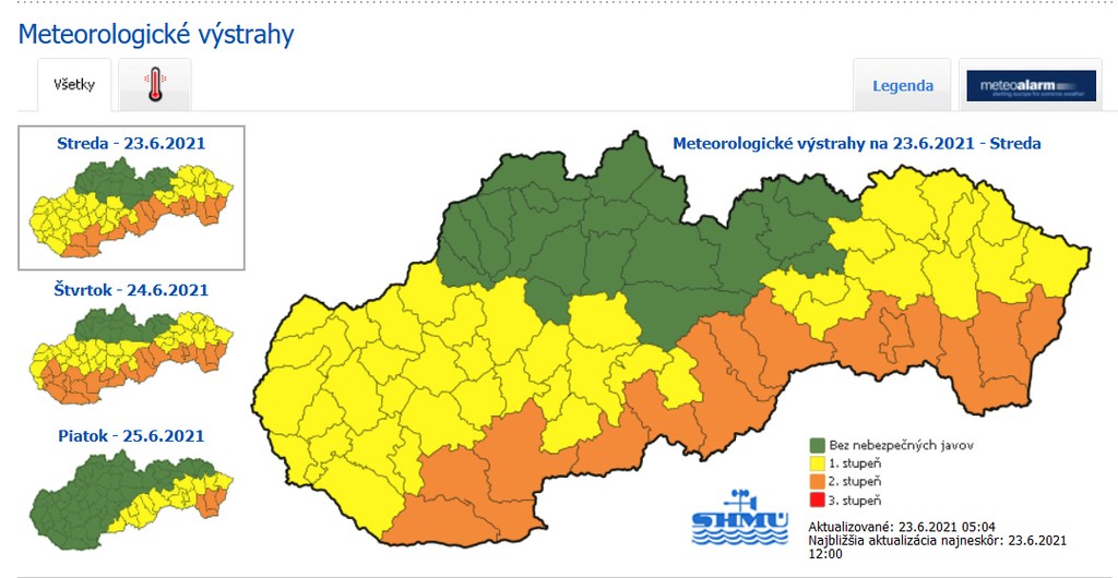 Slovensko potrápia horúčavy aj v stredu. Meteorológovia vydali výstrahy pred vysokými teplotami pre všetky kraje s výnimkou Žilinského. V južných a juhovýchodných okresoch Slovenska platí zvýšená výstraha pred teplom. Výstrahy predbežne platia v stredu od 13.00 do 18.00 h. Slovenský hydrometeorologický ústav (SHMÚ) na to upozornil na svojom webe.