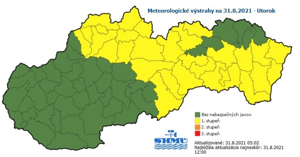 Výstraha prvého stupňa pred dažďom platí v okresoch Kežmarok, Poprad, Stará Ľubovňa, Považská Bystrica a v takmer celom Žilinskom kraji predbežne do stredajšieho (1. 9.) rána.