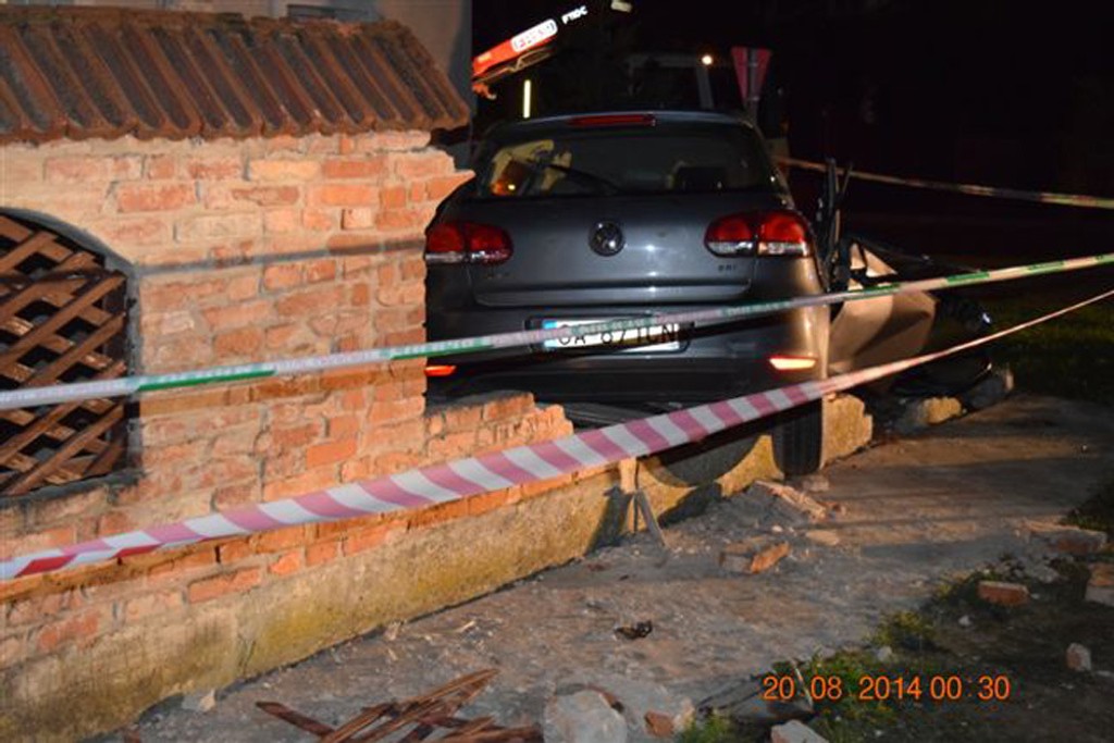 Volkswagen Golf narazil do tehlového múru pri rodinnom dome a zastavil sa až v stene domu. Auto viedol 21-ročný vodič z Veľkej Mače. Na začiatku obce nezvládol riadenie v ľavotočivej zákrute, vyšiel z cesty rovno a narazil do múru.