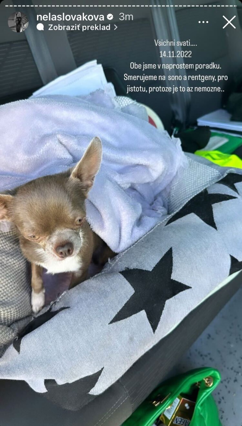 Krátko po 12:00 Nela Slováková svojich fanúšikov informovala, že je v poriadku. Spolu so psom, ktorý cestoval na zadnom sedadle, však idú pre istotu na kontrolný röntgen.