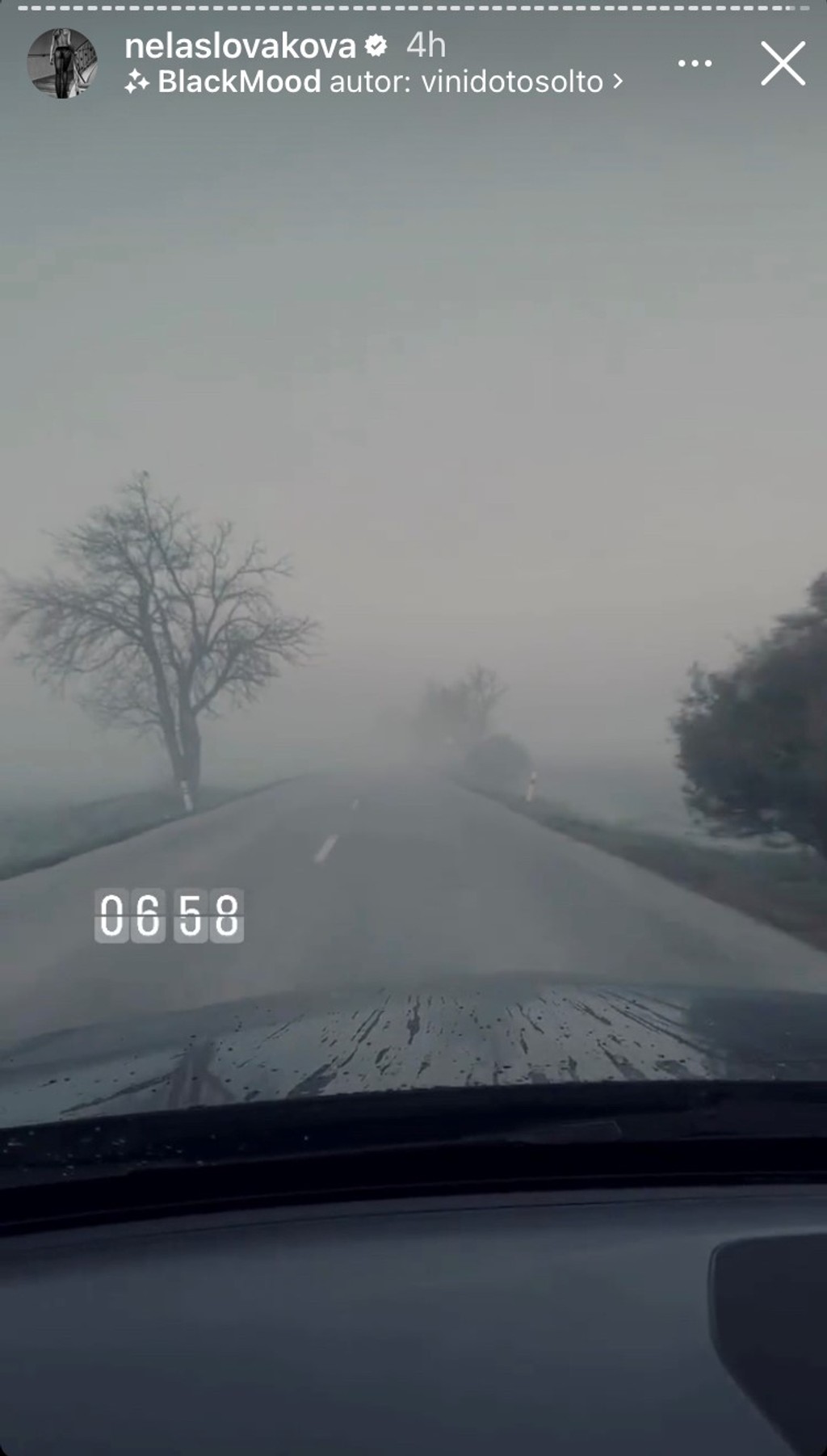 V príbehu na Instagrame krátko pred siedmou ráno zdieľala svoju cestu autom v hustej hmle.