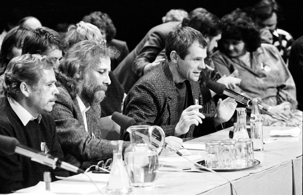 V Slovenskom národnom divadle sa 29. novembra 1989 uskutočnilo manifestačné zhromaždenie, účastníci ktorého nadšene privítali podpis dohody medzi Občianskym fórom a Verejnosťou proti násiliu. Obsiahlej diskusie sa zúčastnili okrem iných aj Václav Havel (vľavo) a Milan Kňažko (3. zľava).