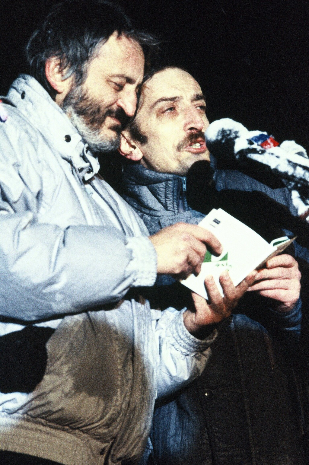 Herci Milan Lasica (vľavo) a Jaroslav Filip spievajú na demonštrácii v Bratislave 26. novembra 1989 na Námestí SNP v Bratislave.