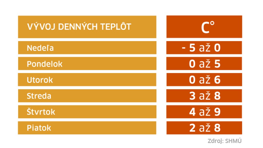 Počasie od pondelka má byť nestále, so zrážkami, ktoré budú v nižších polohách už dažďové, alebo zmiešané a pridajú sa aj hmly a poľadovica, takže to bude záťaž najmä pre šoférov. Postupne sa oteplí. V štvrtok by sa teplota mala vyšplhať na 4 až 9 stupňov.