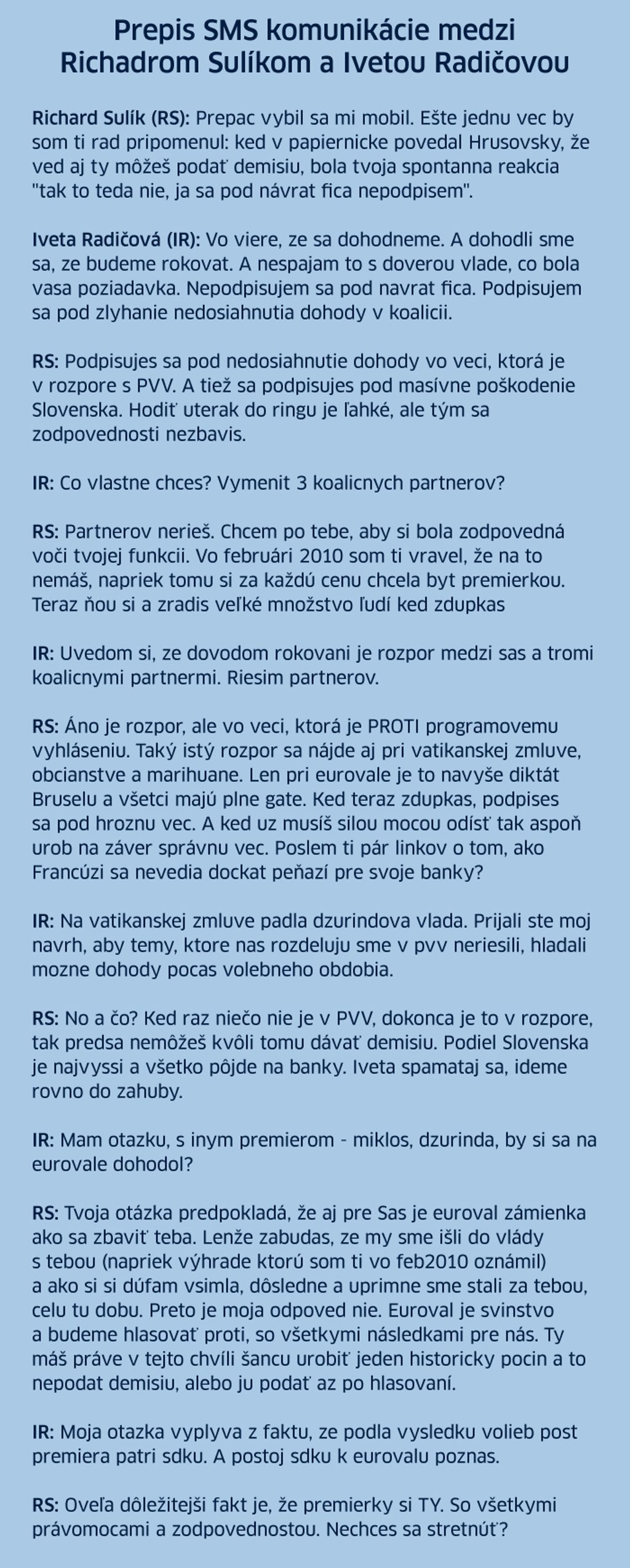 Richard Sulík sa vo svojom komentári pre Aktuality.sk opäť vrátil k pádu Radičovej vlády v roku 2011. Dokonca ukázal celú sms komunikáciu medzi ním a expremiérkou. V jednej pasáži predseda SaS píše o tom, ako na premiérsku stoličku Radičová nemá.