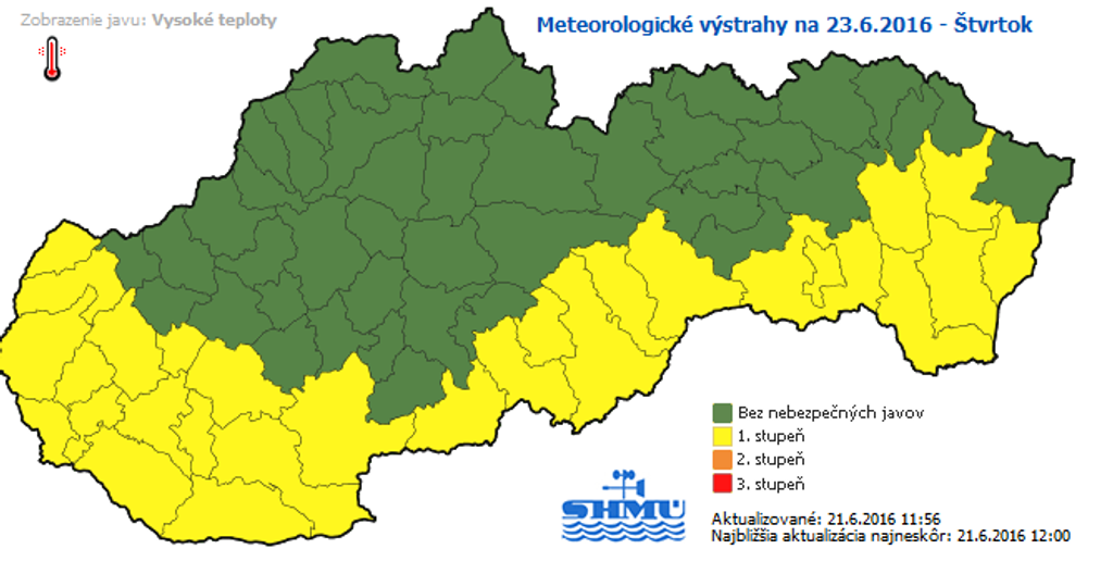 SHMÚ varuje pred vysokými teplotami aj vo štvrtok (23.6.). Zasiahnuť by mali okresy na juhu Slovenska. Meteorológovia v tento deň očakávajú dosiahnutie maximálnej teploty vzduchu 33 až 34 stupňov Celzia.