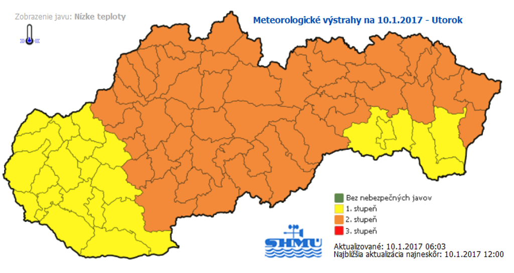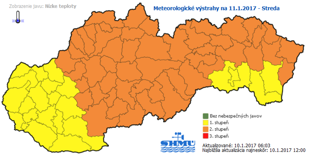 Slovenský hydrometeorologický ústav (SHMÚ) varuje pred nízkymi teplotami na celom Slovensku. V priebehu dnešnej noci a stredy (11.1.) môžu na niektorých miestach klesnúť teploty až na -27 stupňov Celzia. Meteorológovia však zatiaľ nevydali výstrahu na štvrtok (12.1.), kedy by sa už malo otepliť. O výstrahách informuje SHMÚ na svojej internetovej stránke.