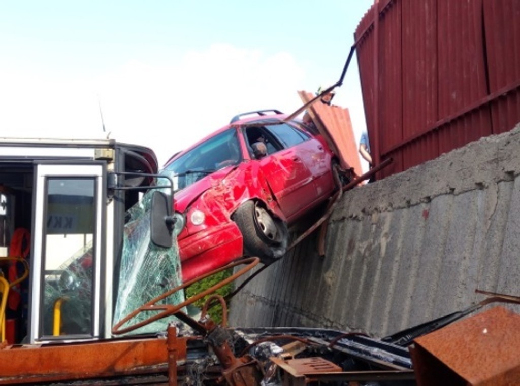 Auto vyletelo z cesty pri predbiehaní, prerazilo plechový plot a zastavilo sa až na zaparkovanom autobuse miestnej autoškoly. Nebyť autobusu, následky nehody mohli byť vážnejšie. Auto by sa totiž pravdepodobne prevrátilo a skončilo na streche.