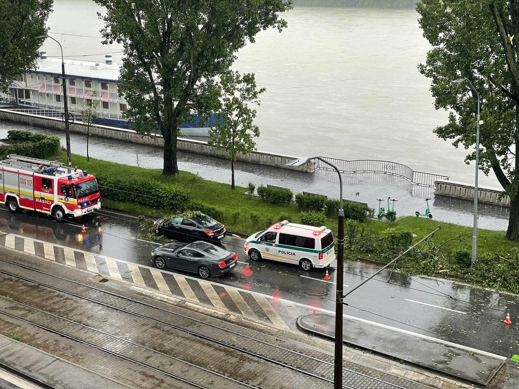 Nepriaznivé počasie komplikuje dopravu aj v hlavnom meste. Vodiči sa zdržia napríklad na nábreží Dunaja za River Parkom smerom na Most SNP. Na čelné sklo idúceho auta tam spadli viaceré konáre. Vodičovi pomáhajú hasiči aj policajti.