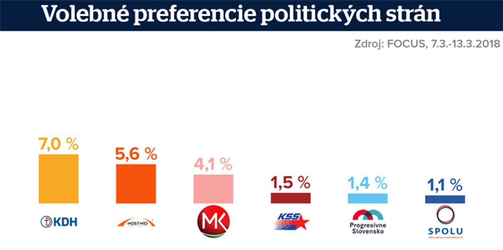 Prah zvoliteľnosti by prekročilo dnes neparlamentné KDH, ktorému by hlas odovzdalo 7 percent voličov. Poslednou stranou, ktorá by splnila limit do parlamentu je najmenšia vládna strana Most-Hís so 5,6 percentami.