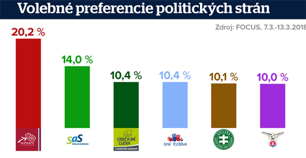 Po 10,4 percenta hlasov by zhodne dostali opozičné hnutia OĽaNO-NOVA a Sme Rodina - Borisa Kollára. Piata v parlamente by bola strana Kotleba - Ľudová strana Naše Slovensko. Šiestou stranou, ktorá by sa dostala ešte do parlamentu, by bola SNS s 10 percentami.