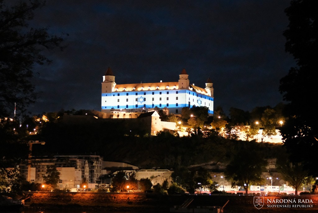 Bratislavský hrad nasvietili v nedeľu (8.10.) večer vo farbách Izraela. Hlavné mesto sa nasvietením hradu pridalo k podobným aktivitám v zahraničí, ktoré vyjadrujú solidaritu s Izraelom.