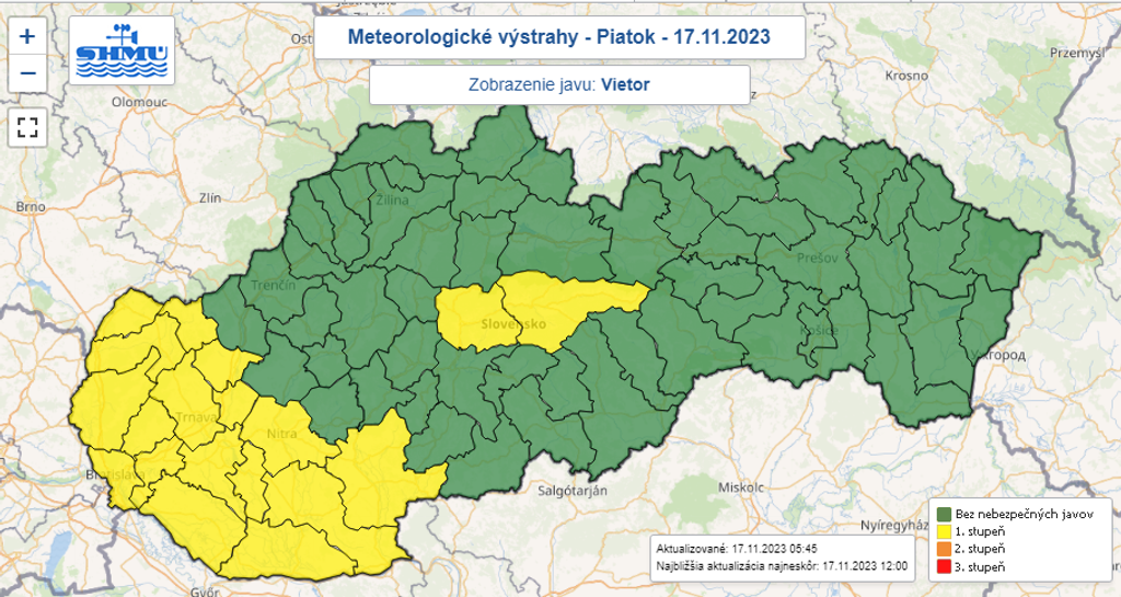 Na západe Slovenska a v okresoch Brezno a Banská Bystrica sa môže v piatok vyskytnúť silný vietor. V okresoch Bardejov, Michalovce, Trebišov a Košice-okolie platia výstrahy pred povodňami. Slovenský hydrometeorologický ústav (SHMÚ) o tom informoval na svojom webe.