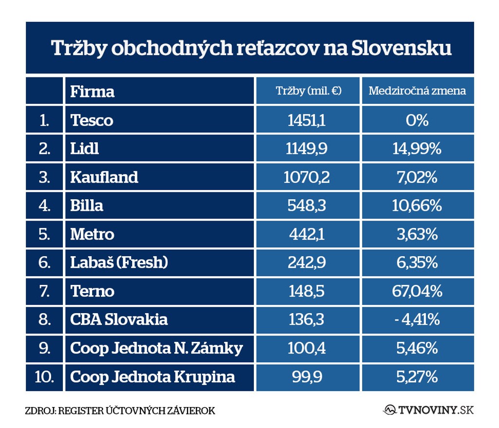 O trochu pomalšie rástli aj tržby tretiemu Kauflandu (7,02 percenta). Len tieto tri obchodné reťazce dokázali prekonať miliardovú hranicu obratu. Ostatní hráči na trhu nedosiahli ani polovičné hodnoty.