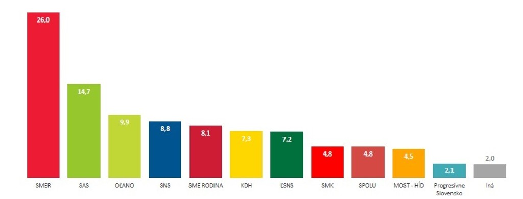 SMK (4,8 percenta), Spolu-občianska demokracia (4,8 percenta), Most-Híd (4,5 percenta), Progresívne Slovensko (2,1 percenta) by zostali mimo snemovne. Inú stranu by volili dve percentá opýtaných.