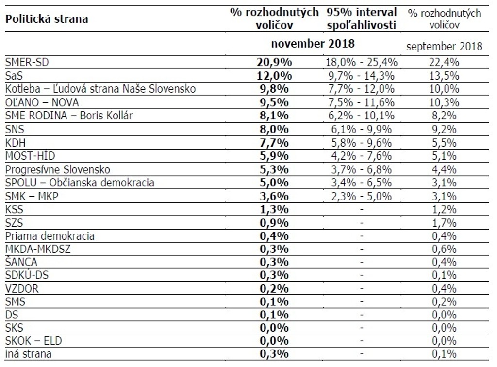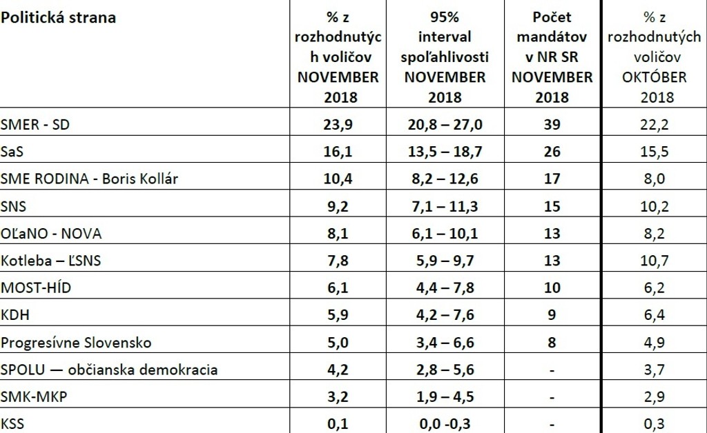 Najsilnejšia koaličná strana Smer-SD by aj v novembri vyhrala parlamentné voľby a mali by 34 mandátov. Do parlamentu by ju posunulo 20,9 percenta ľudí.