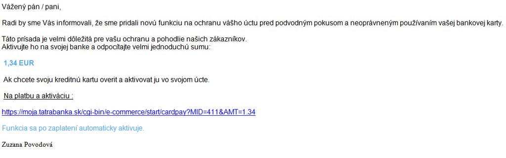 Dotknutá banka pred týmto mailom varuje, keďže podvodníci sa snažia získať citlivé údaje. „Klientom odporúčame, aby zvýšili pozornosť pri poskytovaní osobných a identifikačných údajov. Tatra banka nikdy od klientov nežiada overenie ich citlivých údajov prostredníctvom e-mailovej alebo telefonickej komunikácie," napísala nám hovorkyňa Tatrabanky Zuzana Žiaranová.