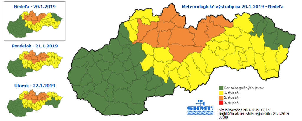 Výstrahu 2. stupňa s platnosťou od nedele 22.00 h do pondelka (21.1.) 08.00 h vydali meteorológovia pre niektoré okresy Žilinského, Banskobystrického a Prešovského kraja.