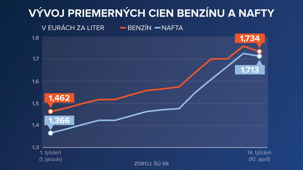 Ešte začiatkom roka stál v priemere liter benzínu euro štyridsaťpäť, začiatkom apríla to bolo takmer o tridsať centov viac. V praxi to znamená, že pri 50-litrovej nádrži motoristi zaplatili trinásť eur navyše.