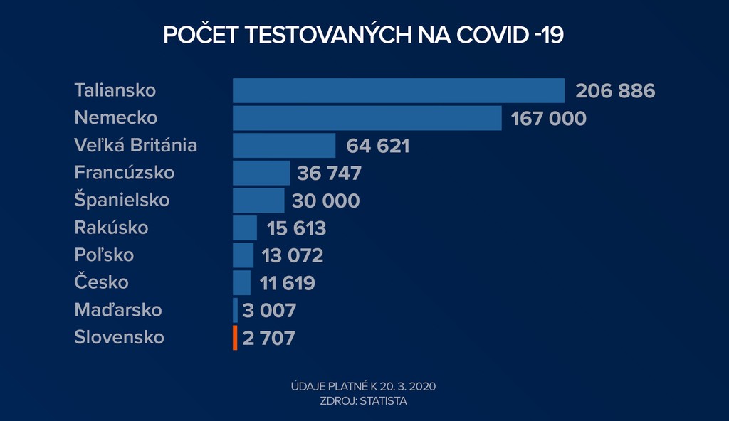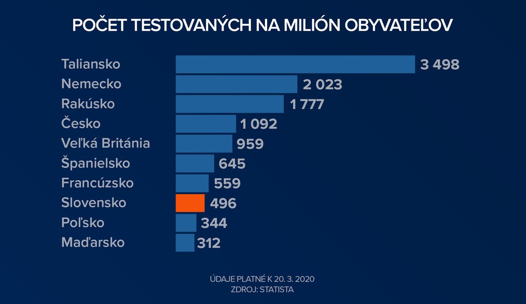 Pokiaľ chceme čo najrýchlejšie vyhrať boj s koronavírusom, je potrebné testovanie. Na Slovensku bolo doposiaľ testovaných na COVID-19 celkovo 4416 ľudí, z ktorých malo 216 pozitívny výsledok. Spomedzi krajín EÚ tak ide o najnižšie čísla aj v prepočte na milión obyvateľov. Spomedzi susedných krajín na tom bolo horšie iba Poľsko a Maďarsko (údaje k 20. 3. 2020).