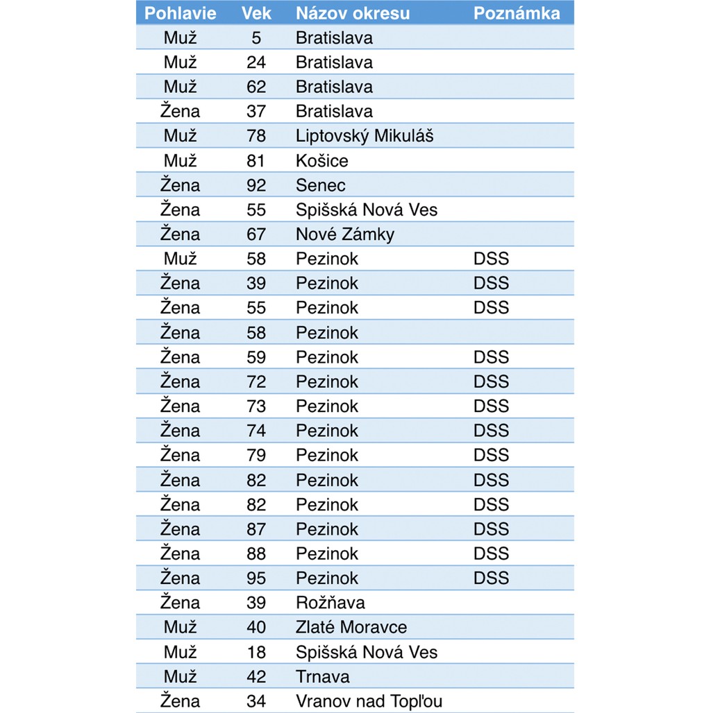 V najnovších prípadoch z predchádzajúceho dňa je evidovaných aj 13 pacientov z Domova sociálnych služieb (DSS) v Pezinku. Niektoré z nich potvrdili ešte počas utorka.