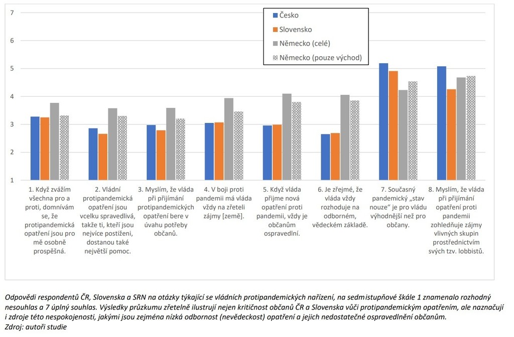 Výsledky prieskumu podľa autorov ukazujú kritickosť občanov ČR a SR voči protipandemickým opatreniam svojich vlád. Naproti tomu obyvatelia Nemecka boli voči vládnym nariadeniam oveľa viac zmierlivejší. Najviac sa to ukázalo pri otázke, či vláda vždy rozhoduje na odbornom základe. Česi a Slováci s týmto výrokom väčšinou nesúhlasili, Nemci boli skôr nerozhodní.