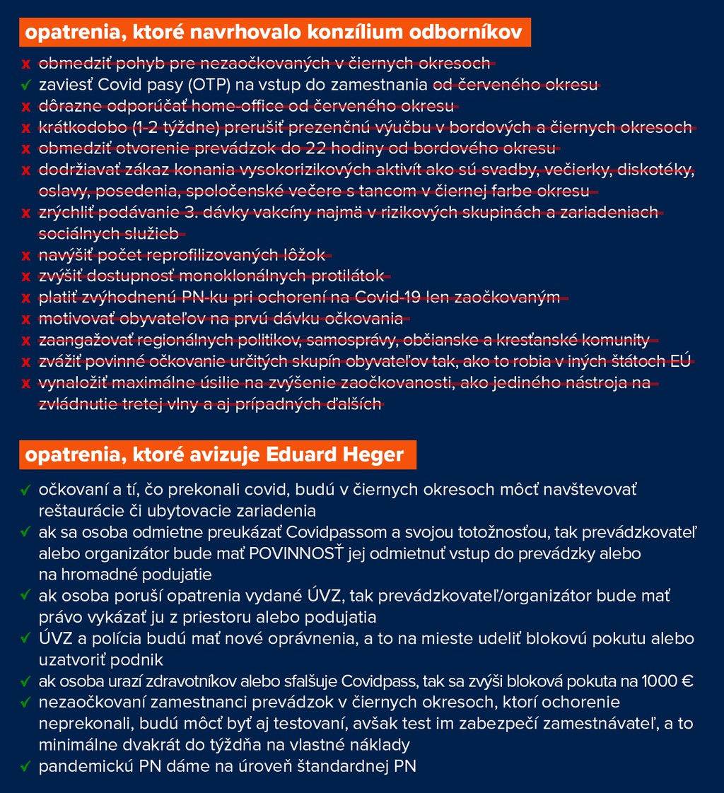 Konzílium odborníkov preto prišlo s návrhmi, ako situáciu ešte zvrátiť a zraziť krivku epidémie na Slovensku. Heger však predstavil sadu opatrení, ktoré sa od tých od odborníkov líšia. Tie najtvrdšie opatrenia koaličná rada neprijala.