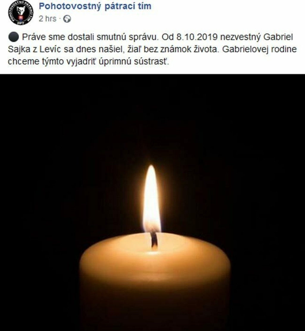 Od začiatku októbra nezvestný bývalý účastník Farmy, Levičan Gabriel Sajka, ktorého nenašli ani špecializované tímy pátračov, je podľa najnovších informácií, ktoré len pred pár hodinami prinesla FB-stránka Pohotovostný pátrací tím, mŕtvy.