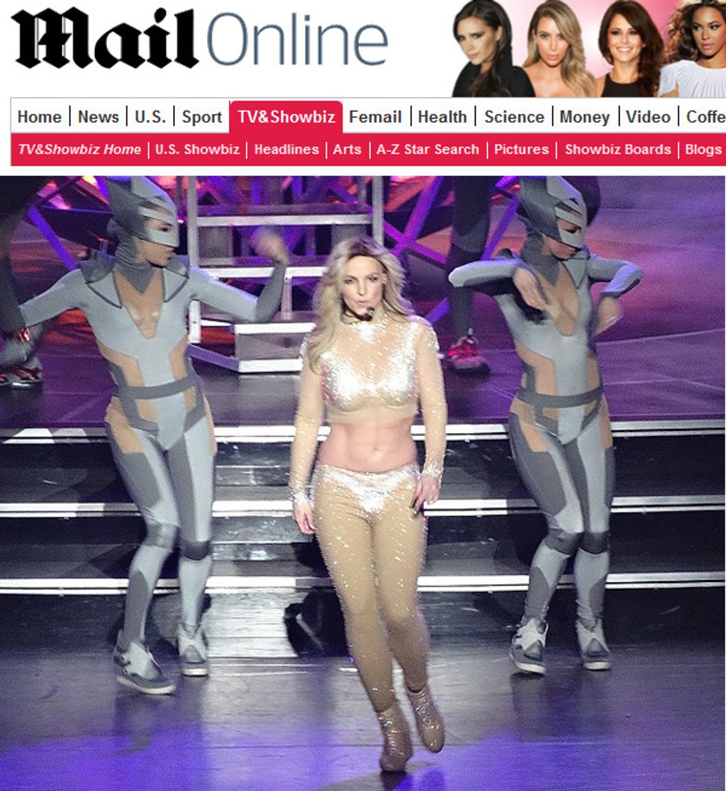 Nie je to síce také ako pred rokmi, ale stále vyzerá dobre. Drina vo fitku sa oplatila. Britney mala na sebe kostým púdrovej farby s odhaleným bruchom. Tehličky na bruchu vytvorené mejkapom si však mohla odpustiť.