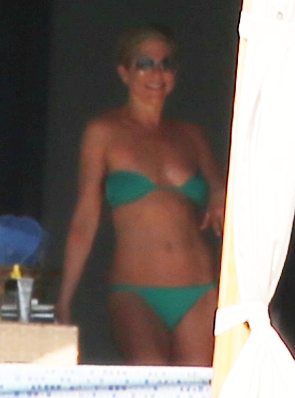 Buď si ich prítomnosť Jennifer nevšimla alebo ich mala úplne na háku. Tentoraz sa opaľovala v zelených bikinách. Aby nemala opálené pásiky, tak si vrchný diel odviazala a zrolovala. Ale prekliato nízko. Stačil jeden pohyb a ukázala by prsia.