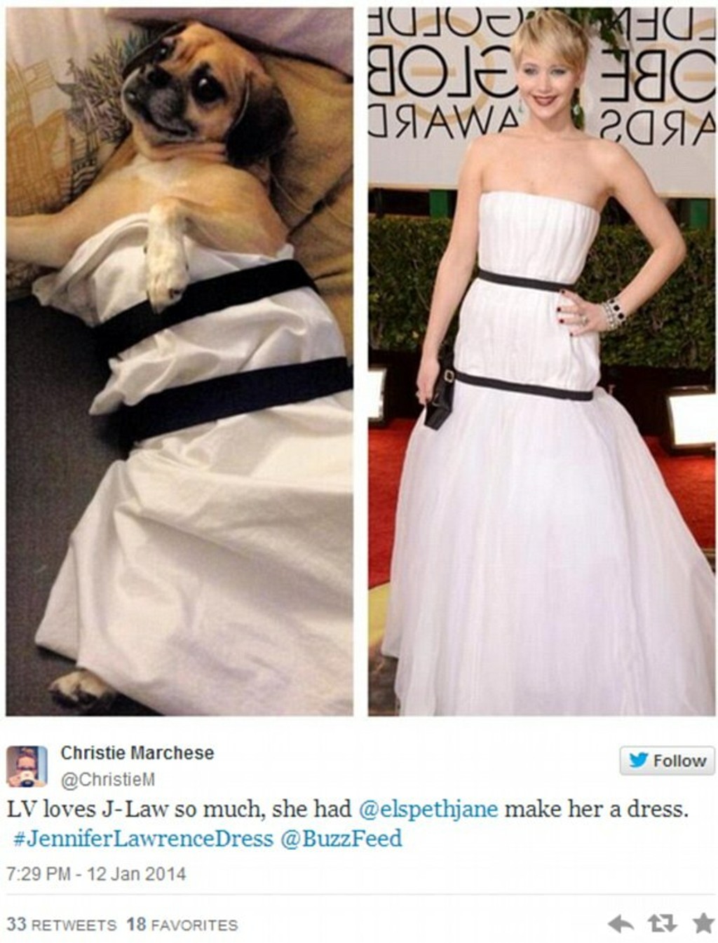 Americká herečka Jennifer Lawrence sa na nedávnom odovzdávaní Zlatých Glóbusov predviedla v bielej róbe od Diora. Napriek tomu, že šlo o svetoznámu luxusnú značku, šaty s dvomi čiernymi pásmi pôsobili príliš jednoducho.