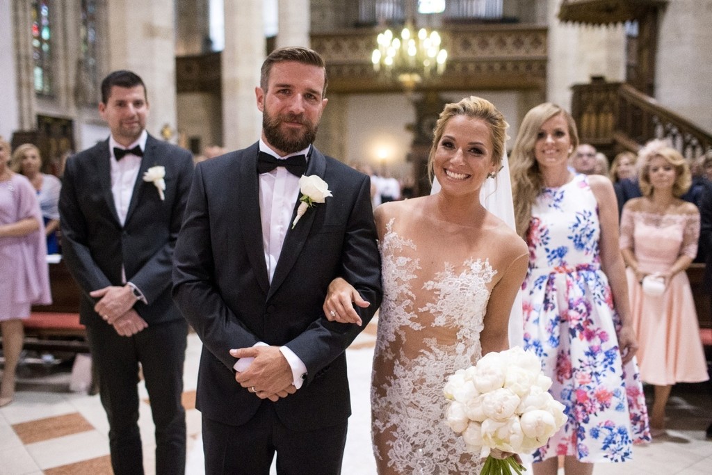 Dominika vyrazila prítomným hosťom dych, keď ladne prešla uličkou v šatách z prehliadkovej kolekcie španielskej značky Pronovias Atelier, ktoré dopĺňali honosné šperky.