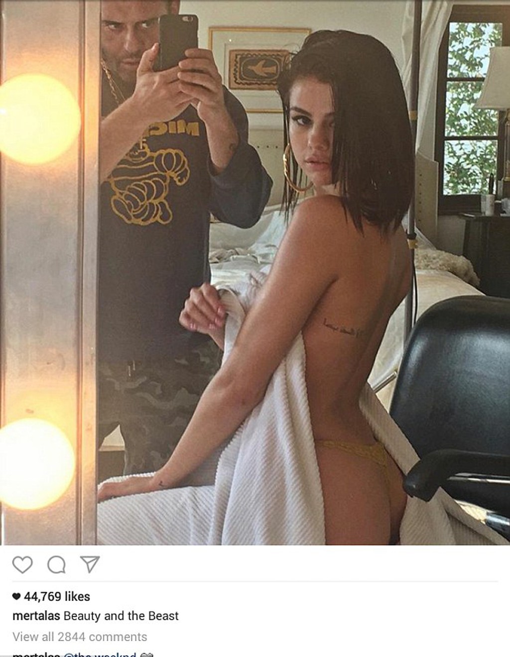 Selena má na sebe len čipkované tango nohavičky telovej farby a odhalené prsia si zakrýva bielou dekou. Ešte nikdy takto provokatívne nevystrkovala sexy zadok. Akoby chcela vyprovokovať svojho nového priateľa, rapera The Weeknda.