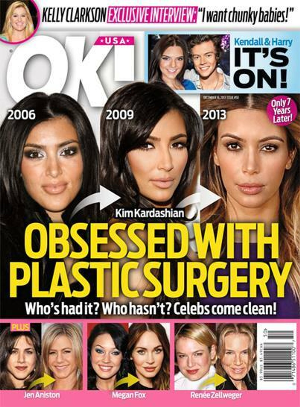Magazín OK! si zobral reality hviezdu na mušku a detailne porovnali jej snímky v priebehu rokov. Na nich je jasne vidieť, ako sa snúbenici Kanyeho Westa zmenila tvár. Zrazu mala rovnejší nos bez vyhnutej špičky, neskôr bradu a tohtoročné snímky ukazujú, že ju má ešte menšiu a oveľa plnšie pery. Aj tvár má akosi čudne natiahnutú. Tak kde bude pravda?