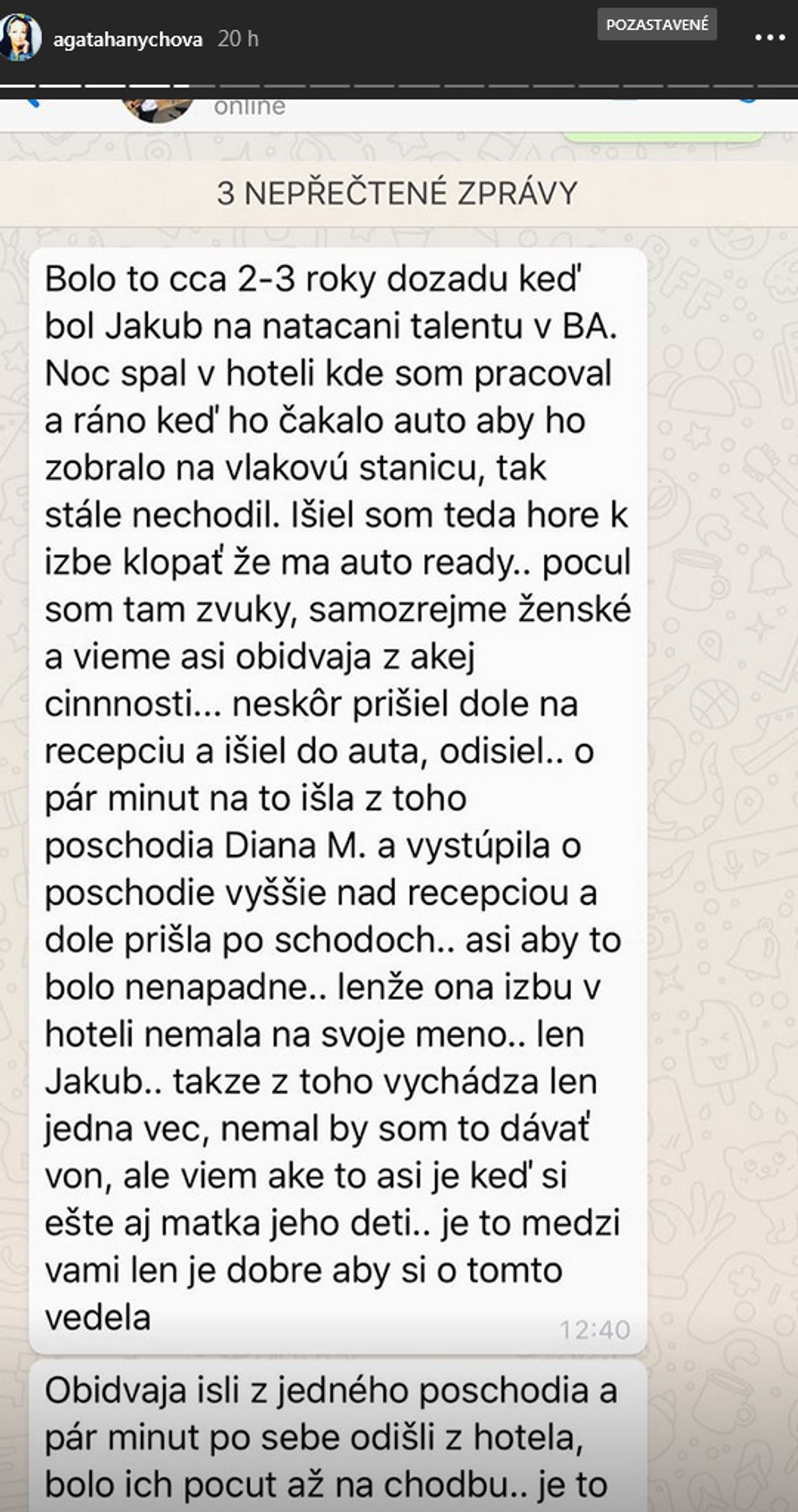 Herečka dostala zopár nemilých správ, v ktorých jej zamestnanec istého hotela opisuje, ako jej manžel mal stráviť noc so známou slovenskou herečkou. Jakub a Diana Mórová mali ráno vyjsť z jednej hotelovej izby a snažili sa to spraviť tak, aby si ich nikto nevšimol.