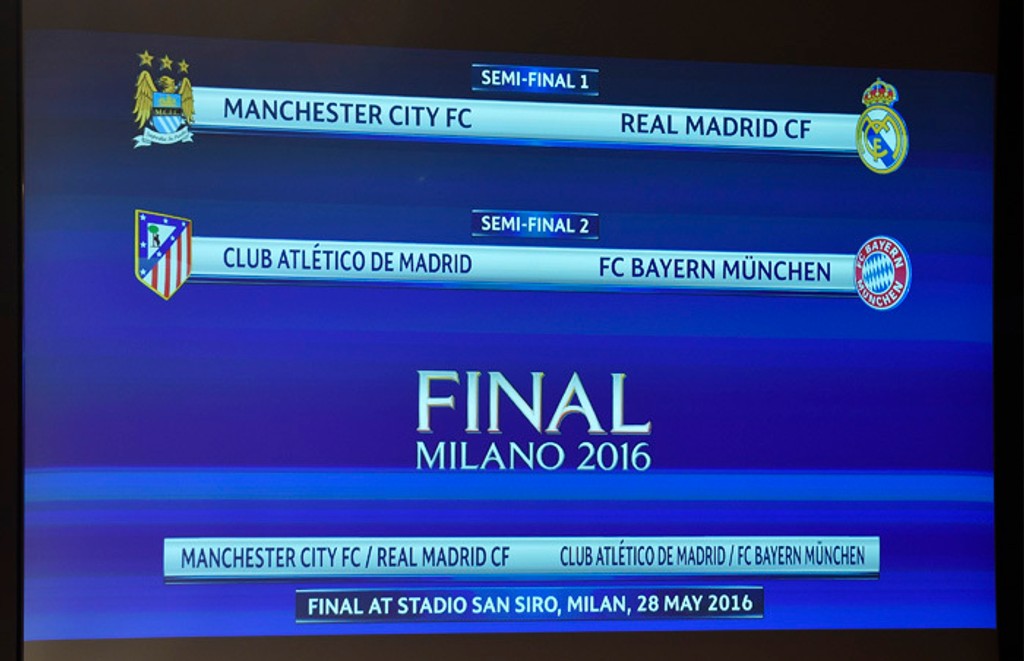 Rekordný 10-násobný držiteľ európskeho pohára číslo jeden Real Madrid nastúpi v semifinále futbalovej Ligy majstrov 2015/2016 proti debutantovi v tejto fáze Manchestru City. Druhú dvojicu tvoria Atletico Madrid a Bayern Mníchov.