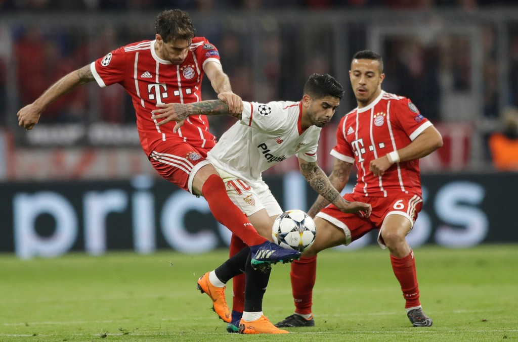 V Allianz Arene si čerstvý nemecký rekordný šampión v prvom dejstve kontroloval postupovú situáciu, hoci Sevilla bola aktívna a hrala ofenzívne. Bavori už v 3. minúte mohli otvoriť skóre, ale James Rodriguez tesne minul z priameho kopu.