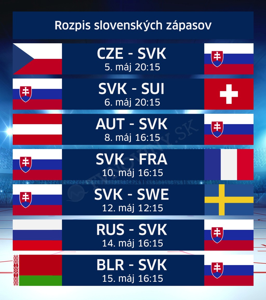 A-skupina /Royal Aréna, Kodaň/: Rusko, Švédsko, Česko, Švajčiarsko, Bielorusko, SLOVENSKO, Francúzsko, Rakúsko