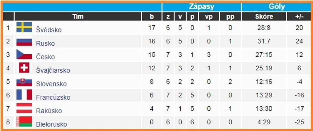 V tabuľke majú Švajčiari 12 bodov a do vyraďovačky postúpili ako posledný tím z A-skupiny zo štvrtého miesta. Slováci mali pred zápasom s Bieloruskom na konte 8 bodov a aj keby zvíťazili, nemôžu už Švajčiarov predstihnúť. Slovenskí hokejisti nepostúpili na MS zo skupiny už päť rokov za sebou. Naposledy sa im to podarilo na MS v Helsinkách v roku 2013.