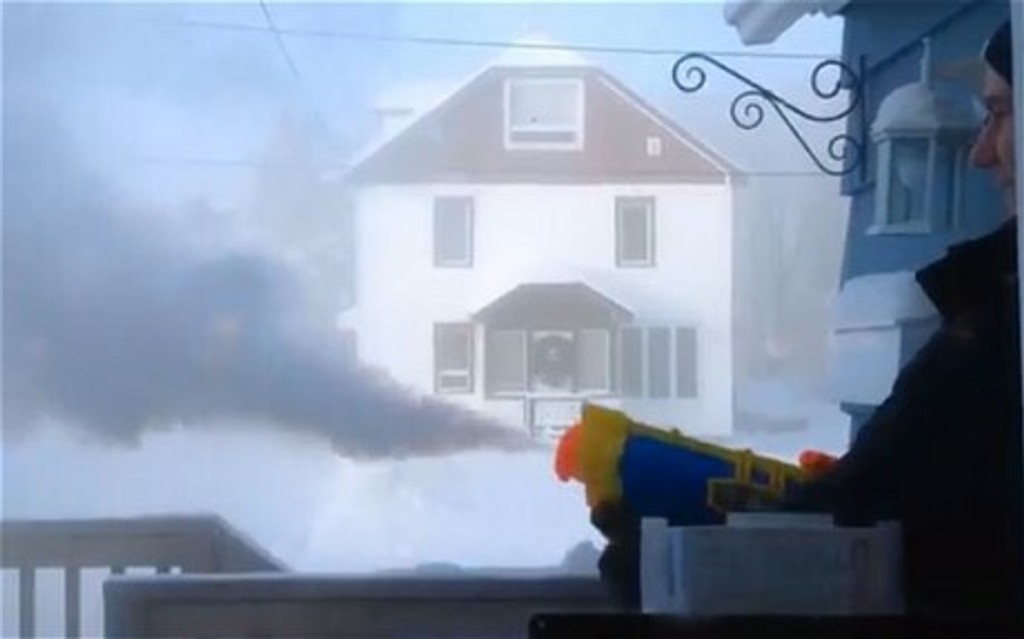 S detskou zbraňou, do ktorej nalial vriacu vodu, vyšiel na verandu domu. Keď do vzduchu vystrekol vodu, na zem nestihla ani dopadnúť. Okamžite sa zmenila na prašný ľad.