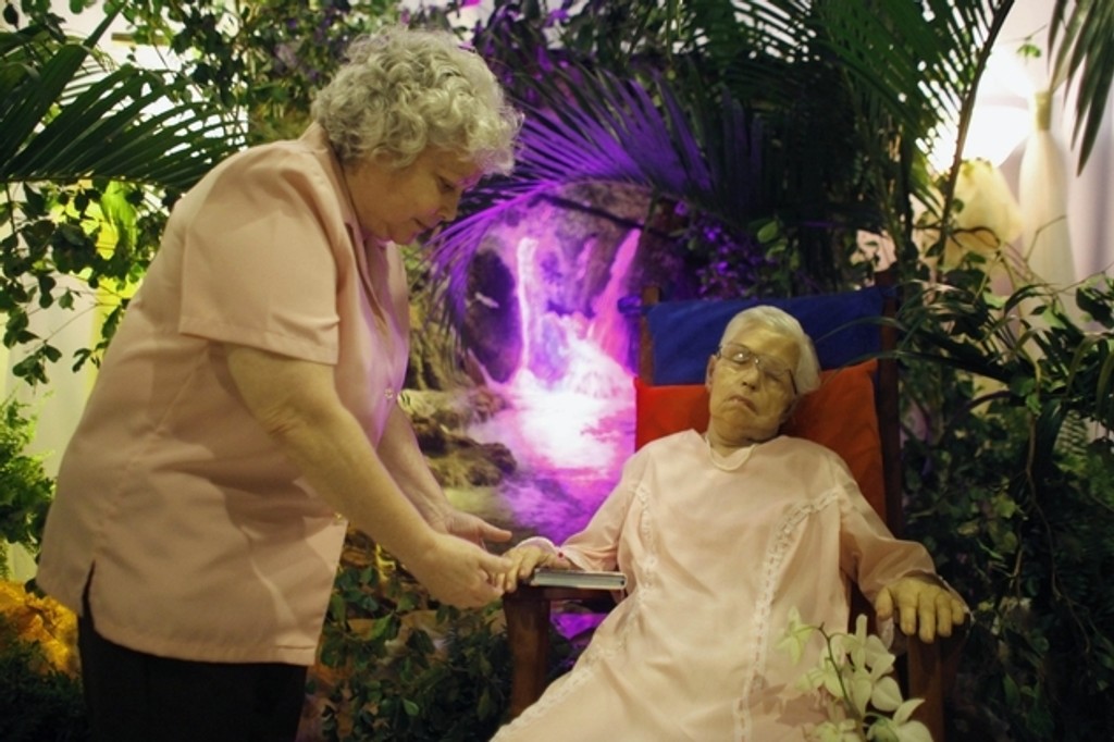 Telo zosnulej 80-ročnej Georginy Chervony Llorenty posadili do jej obľúbeného červeného hojdacieho kresla a obliekli jej svadobné šaty, ktoré mala na sebe pri druhej svadbe pred 32 rokmi. Georgina chcela byť obklopená kvetinami a rastlinami.