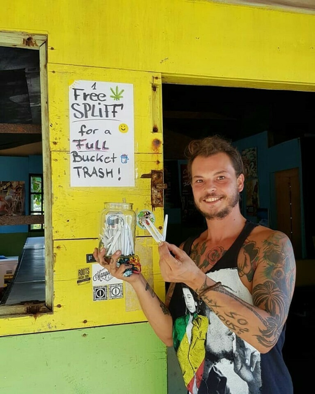 Mladý muž vymyslel zaujímavý spôsob, ako navnadiť turistov na to, aby upratovali znečistené pláže od odpadkov. Na Jamajke ponúka za kôš plný smetí marihuanu. Jeho heslo je „Pomôžte zachrániť planétu. Vezmite odpadky a dostaňte sa do nálady".