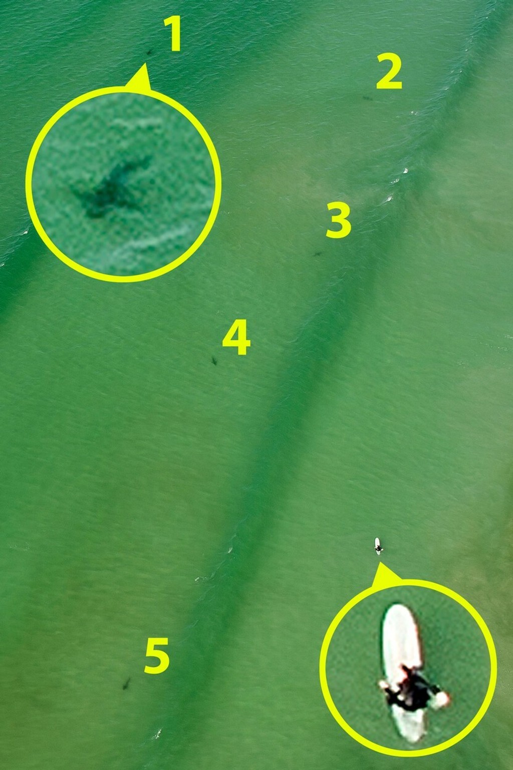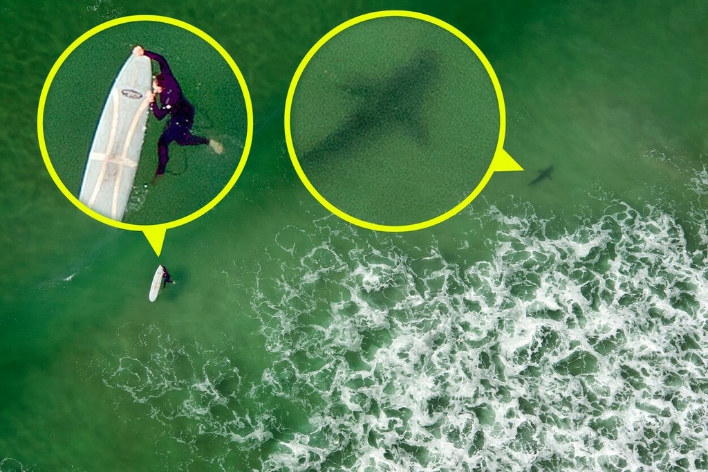 Surferka netušila, že ju v mori pri juhoafrickom pobreží obkolesujú predátori. Z helikoptéry sa podaril zachytiť desivý detailný záber, ktorý ukázal, že okolo nej plávalo až päť žralokov. Žena v pokoji plávala na surferskej doske a nohy mala namočené vo vode. Keby vedela, že vo vode nie je sama, zrejme by rýchlo prchla preč.
